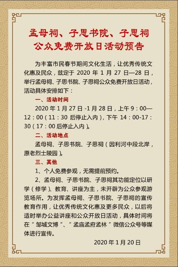 新年將至,孔子文旅集團(tuán)鄒城市鄒魯文化公司結(jié)合文化旅游內(nèi)涵,深挖冬季旅游特色,聯(lián)合孟廟孟府、博物館、孟母三遷祠等景區(qū)推出一系列精彩紛呈的春節(jié)傳統(tǒng)禮儀體驗(yàn)活動(dòng),快來(lái)一睹為快吧!
