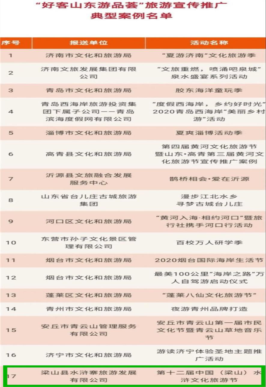 近日,山東省文化和旅游廳發(fā)布了《關(guān)于公布“好客山東游品薈”旅游宣傳推廣典型案例名單》,確定全省32個案例為“好客山東游品薈”旅游宣傳推廣典型案例,其中,孔子文旅集團梁山縣水滸寨旅游發(fā)展公司承辦的第十二屆中國(梁山)水滸文化旅游節(jié)活動成功入選,今后將納入全省旅游宣傳推廣營銷培訓(xùn)案例教學(xué)進行宣傳推廣。