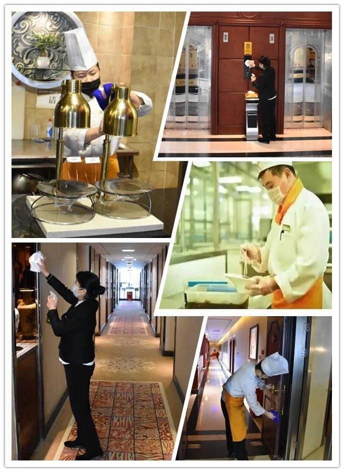 餐飲部設計菜單時避開海鮮等生鮮菜品,廚房制作菜肴確保蒸熟煮熟;包間進行開窗通風,餐具嚴格按照消毒程序進行消毒;廚師操作過程中佩戴一次性手套及口罩。